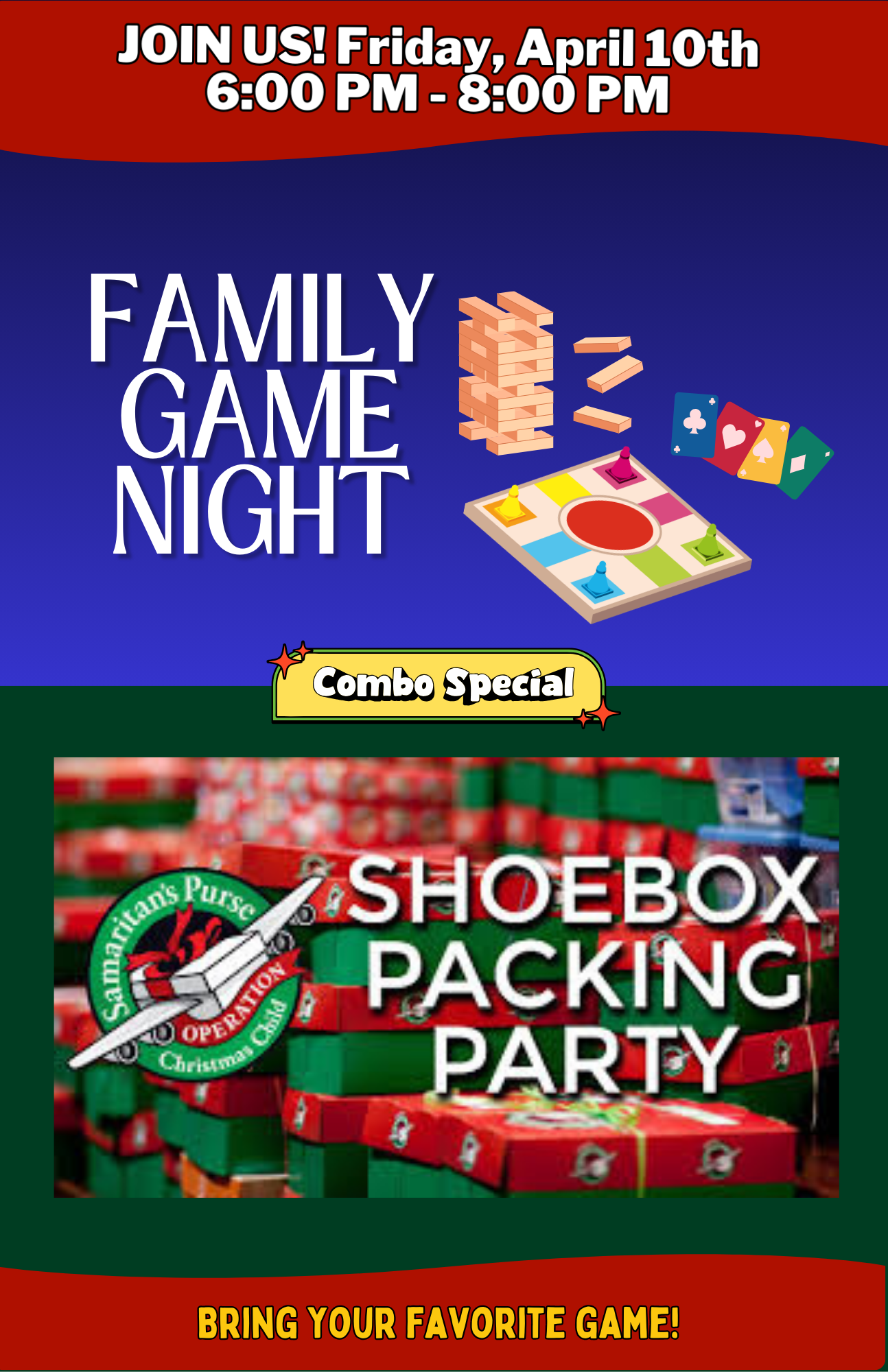 Join us for a fun and meaningful time together! Bring your favorite game and gather the whole family as we pack boxes for Operation Christmas Child, enjoy fellowship, and play games. The bounce house will be up and ready too—there’s something for everyone! All are welcome, and we’d love to see you there!